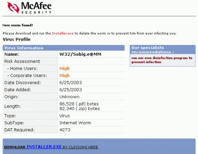 Aunque este troyano no es nuevo, Network Associates ha reportado que se ha estado distribuyendo recientemente en forma de spam, en un mensaje que simula ser una alerta del soporte de McAfee.