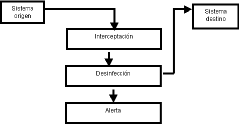 2. Emitir una alarma a la interfaz del usuario. Esta interfaz de usuario puede ser también muy diversa. En un antivirus para una estación de trabajo puede ser un mensaje mostrado por pantalla, pero en una solución para servidores la alarma puede consistir en un mensaje de correo electrónico, un mensaje a la red interna, una entrada en un informe de actividad o una comunicación de algún tipo a la herramienta de gestión del antivirus.