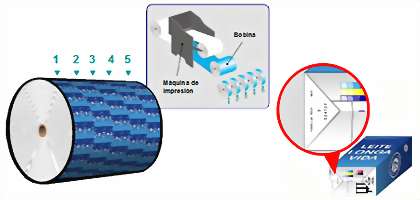 Los envases de leche son producidos en grandes bobinas y, de esta forma, son enviados a los clientes (productores de leche). Los productores reciben las bobinas, que son colocadas en las máquinas envasadoras y forman un envase (cajita) al mismo tiempo que tiene lugar el llenado con el producto.