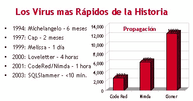 Recordemos que al virus ILoveYou (o Loveletter), le tomó 4 horas convertirse en una infección mundial. Pronto fueron apareciendo sus sucesores, los cuales mejoraron estos tiempos, pero este virus marcó un punto de partida para una nueva generación de infecciones globales, como se puede apreciar en la siguiente gráfica: