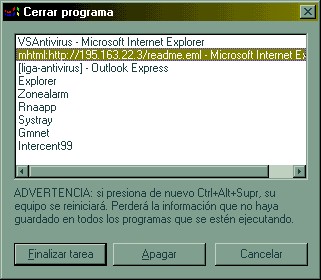 Para limpiar un sistema infectado, primero finalice el proceso actual del gusano, pulsando CTRL+ALT+SUPR y marcando y finalizando cualquier tarea con este formato: