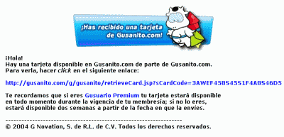 El ejemplo enviado, se trata de un mensaje con una supuesta tarjeta de felicitación que simula provenir de "Gusanito.com" (un servicio de envío de tarjetas).