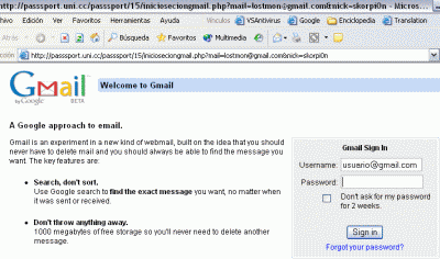 Note que en la barra de direcciones no se muestra la dirección de Gmail, sino la dirección del falso sitio (http:/ /passsport .uni