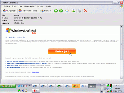 Como um de nossos usuários VIP de Hotmail, queremos convidá-lo a experimentar nossa próxima geração de e-mail com base na Web - o Windows Live Mail Beta. O serviço vem sendo desenvolvido e aprimorado há algum tempo para proporcionar a melhorar experiência de email da Internet , e temos certeza que você vai gostar de conhecê-lo e testá- lo em primeira mão. Entre já !