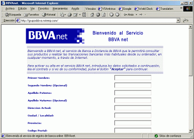 BBVAnet es el servicio de Banca a Distancia del Banco Bilbao Vizcaya Argentaria. Un lector nos envió un mensaje, donde se le indicaba un sitio de Internet, en apariencias perteneciente a dicho banco, en donde debería ingresar los datos necesarios para activar su alta en BBVAnet.