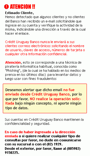El 26 de abril de 2005, recibimos varios ejemplos de un nuevo "scam" en forma de correo no solicitado, creado con la intención de estafar a clientes de Crédit Uruguay Banco.