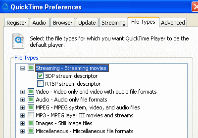 Se sugiere deshabilitar la asociación con archivos RTSP en QuickTime. Para ello, seleccione las propiedades del programa, "File Types", y en "Streaming - Streaming movies", desmarque la opción "RTSP stream descriptor".